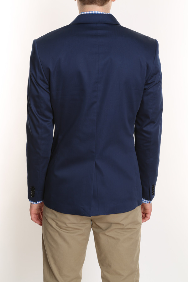 Two button, single vented, notched lapels. Slim cut through the shoulders chest and waist. Flap pockets, welt inside chest pockets. Cotton/lycra. Dry clean.